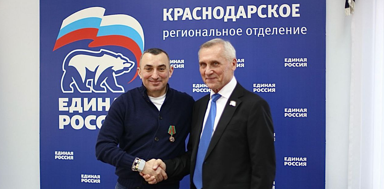 Награда прибыла в Краснодарское региональное отделения партии «Единая Россия», где и была вручена депутату краевого парламента Борису Юнанову. Парламентария поздравил секретарь Краснодарского реготделения партии, первый вице-спикер ЗСК Николай Гриценко. Он отметил большой вклад Бориса Юнанова не только в гуманитарное обеспечение военнослужащих и гражданское население, но и в восстановление инфраструктуры.