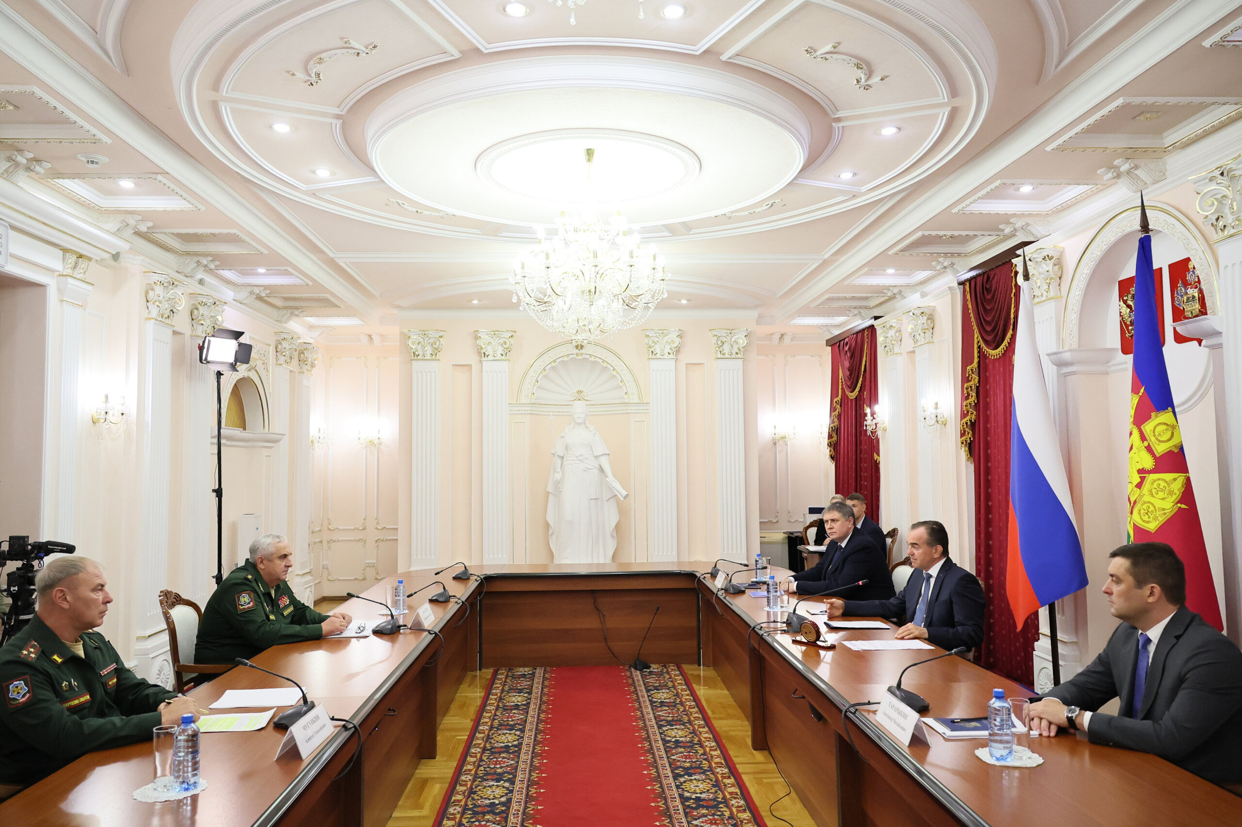 На встрече главы Кубани Вениамина Кондратьева с временно исполняющим обязанности командующего войсками Южного военного округа Владимиром Кочетковым обсуждались вопросы, касающиеся осеннего призыва и оказания помощи участникам СВО. В мероприятии также участвовали Алексей Чугункин, занимающий должность военного комиссара Краснодарского края, и первый заместитель губернатора Игорь Галась — сообщает пресс-служба администрации края.
