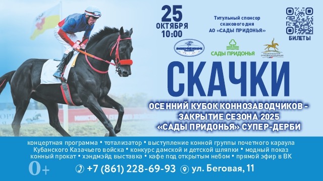 В субботу, 25 октября, в 10:00 на Краснодарском ипподроме состоятся скачки в честь Осеннего кубка коннозаводчиков – Закрытия сезона 2025. Будут разыграны призы для жеребцов и кобыл 2-х лет и старше, чистокровной верховой и ахалтекинской пород на дистанции от 400 до 2400 метров.